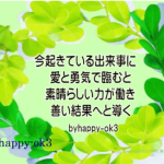 2016年10月31日 / 最終更新日時 : 2016年10月31日 happy-ok3 未分類 許す事は喜びにつながる 10月31日(月)熊本地震から6か月。また台風の被害、再度のイタリア地震、鳥取地震に際し、心からお見舞い申し上げます。 『喜びにつながる道に進む。』実祝プランニング語録嫌な事があったとしても、 その事ばかりにとらわれてい […]