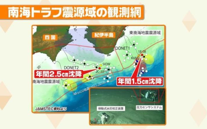 南海トラフ地震の海域では同じように海底でのリアルタイム観測が