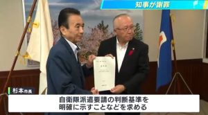 杉本市長は自衛隊派遣要請の判断基準を明確に示すことなどを求めた。