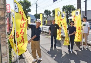 国道10号沿いに黄色い旗を立てる