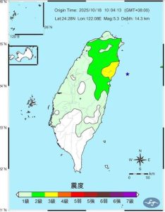 M5.3の地震では、北東部・宜蘭県と東部・花蓮県で震度3を観測。
