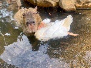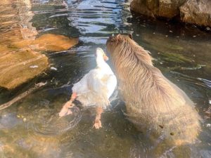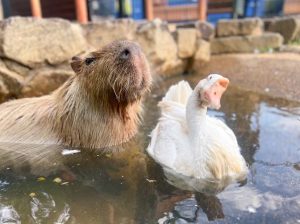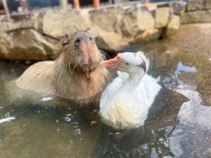 「仲良しなカピバラのパピコとガチョウのおばあちゃん♪」とポスト。