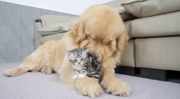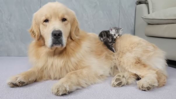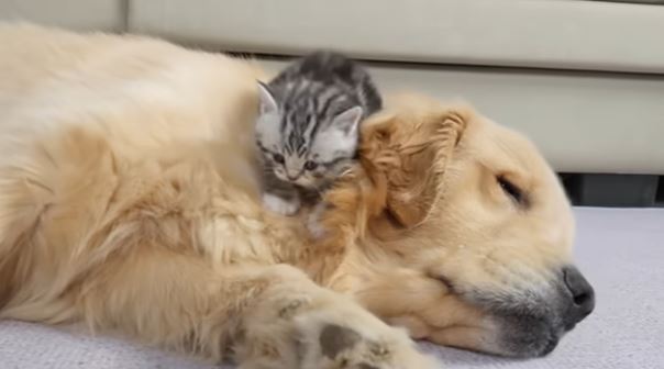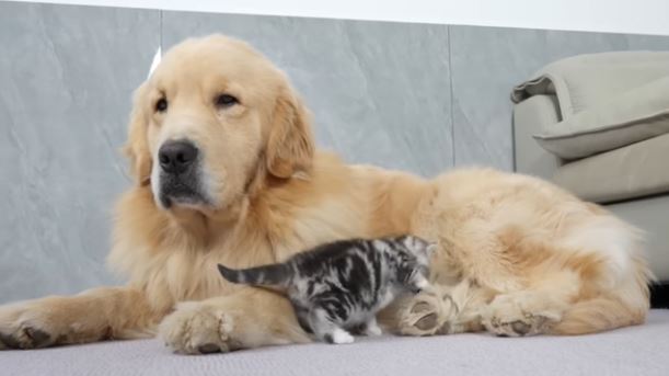 ある日、大きな体のゴールデンレトリバーに出会った子猫。