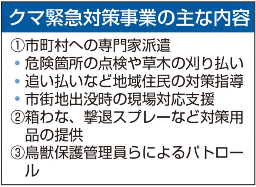 県は24日、市町村への専門家派遣や箱わな、撃退スプレーといった