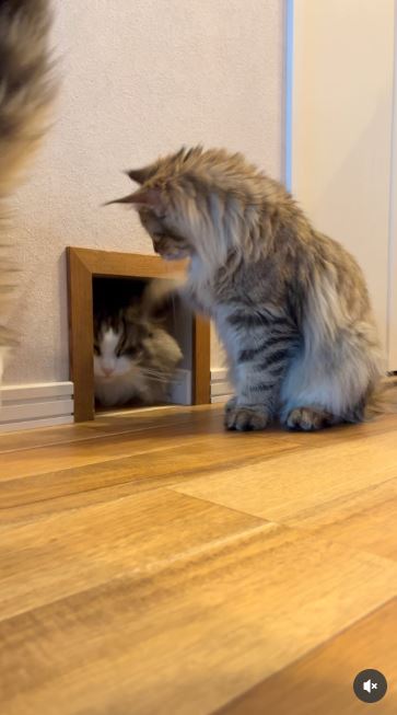 レイパパレちゃんは、壁に設置された猫用の通路の中をのぞき込んでいた。