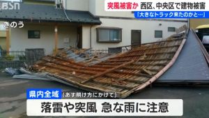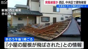 新潟市 西区では27日午後1時ごろ、小屋の屋根が飛ばされたという