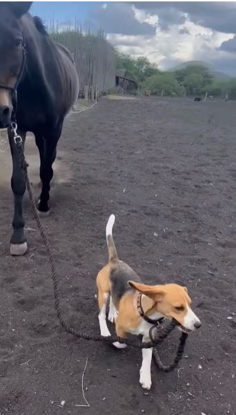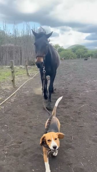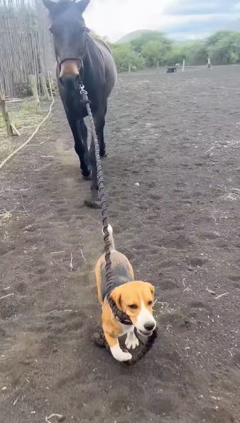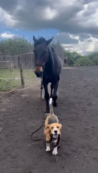 バケットは、その小さな体で馬の手綱をぐいぐい引っ張り、上手に先導。