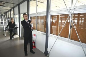 2階建ての仮設校舎がグラウンドにほぼ完成した。