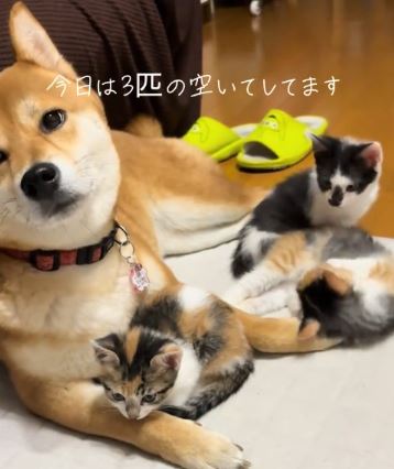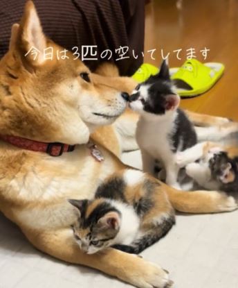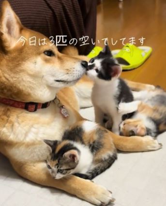 子猫たちと柴犬「こむぎ」ちゃんの姿。