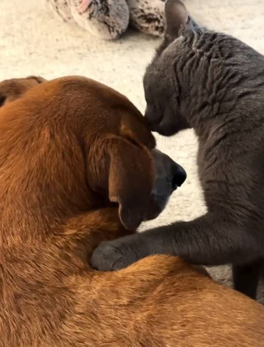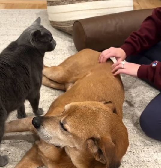 老犬のオークリーが優しく、猫のリバーに接していた。