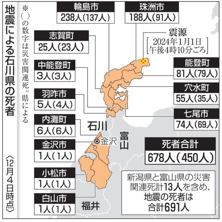 地震の死者は石川、新潟、富山3県で計691人となった。