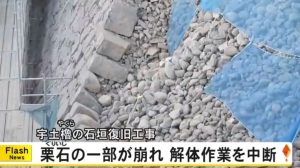 【宇土櫓の石垣の復旧工事で栗石の表層の一部が崩落】