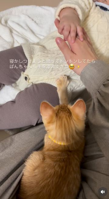 優しく手を添えて寝かしつけを始めたぽんずちゃん。