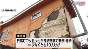 避難中の73歳の女性が凍結路面で転倒し、左腕を骨折。