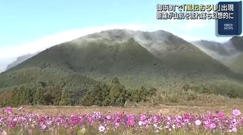 20日朝には、白い霧が緑の山肌をゆっくりと滝のように