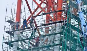 鉄塔の復旧工事を行っていたNTT青森八戸ビル屋上では