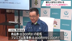 8千円分の商品券配布とプレミアム食事券を発行すると発表。