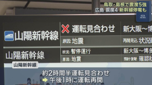 広島で震度4 新幹線で停電も)