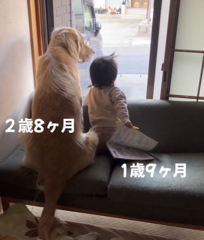 窓辺にはゴールデンレトリバーの男の子と1歳の男の子が並び、