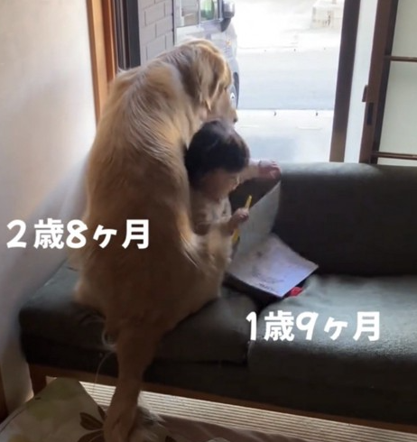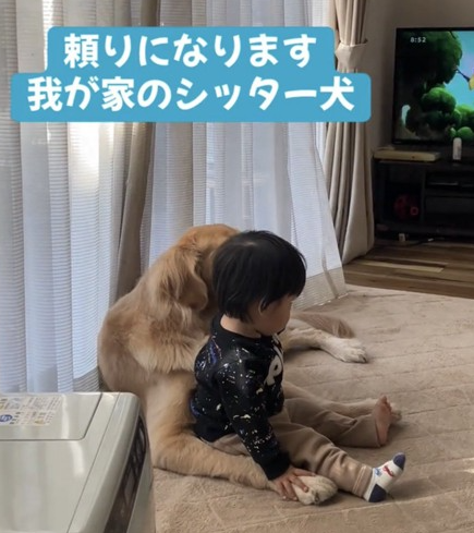 赤ちゃんが動いても、犬は嫌がる様子を見せることなく、