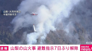 ◆上野原市で8日に発生した山火事は、隣接する大月市側にも