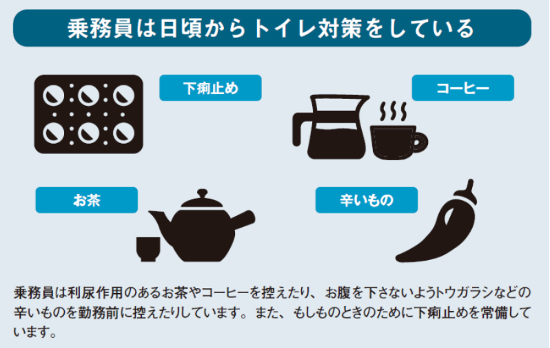 そのため乗務員は利尿作用のあるお茶やコーヒーを控え、