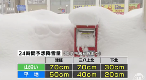 津軽と三八上北は山沿いが70㎝、津軽の平地が50㎝。