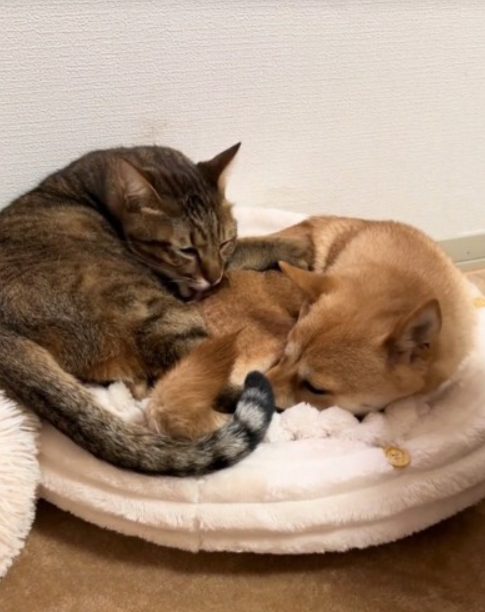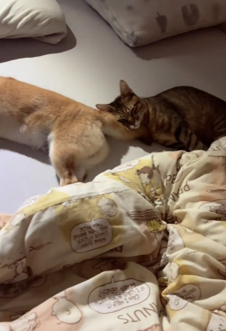 みとくんがはるくんのしっぽを枕代わりにして