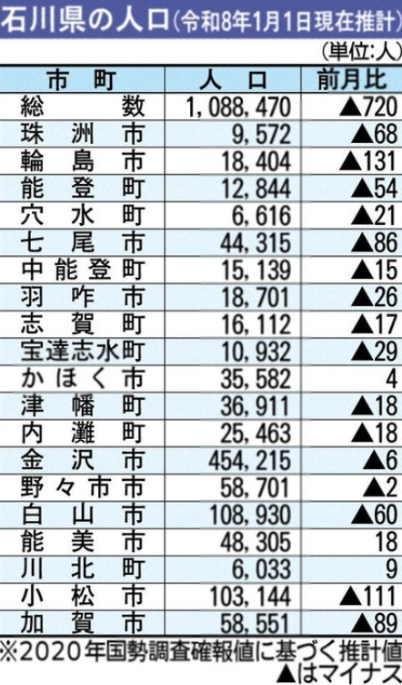 ◆石川県は2日、1月1日時点の県内の人口と世帯の