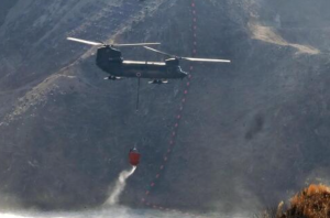 自衛隊のヘリが出動。近くで水をくみ、山に散水した。