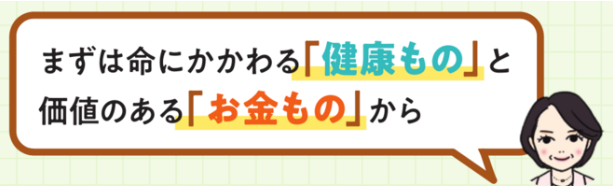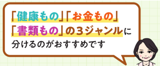 「健康もの」「お金もの」「書類もの」の3つに分ける。