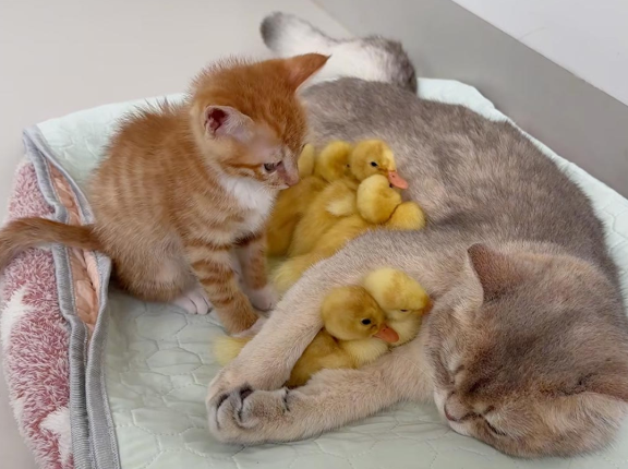 アヒルの赤ちゃんが、子猫と追いかけっこを楽しんだ。