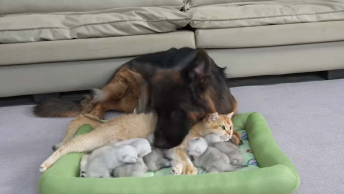 母猫が子猫たちのお世話をしていると、それに気づいた