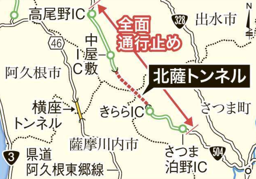 北薩トンネルの全面通行止め区間が一目で分かる地図(南日本新聞社)